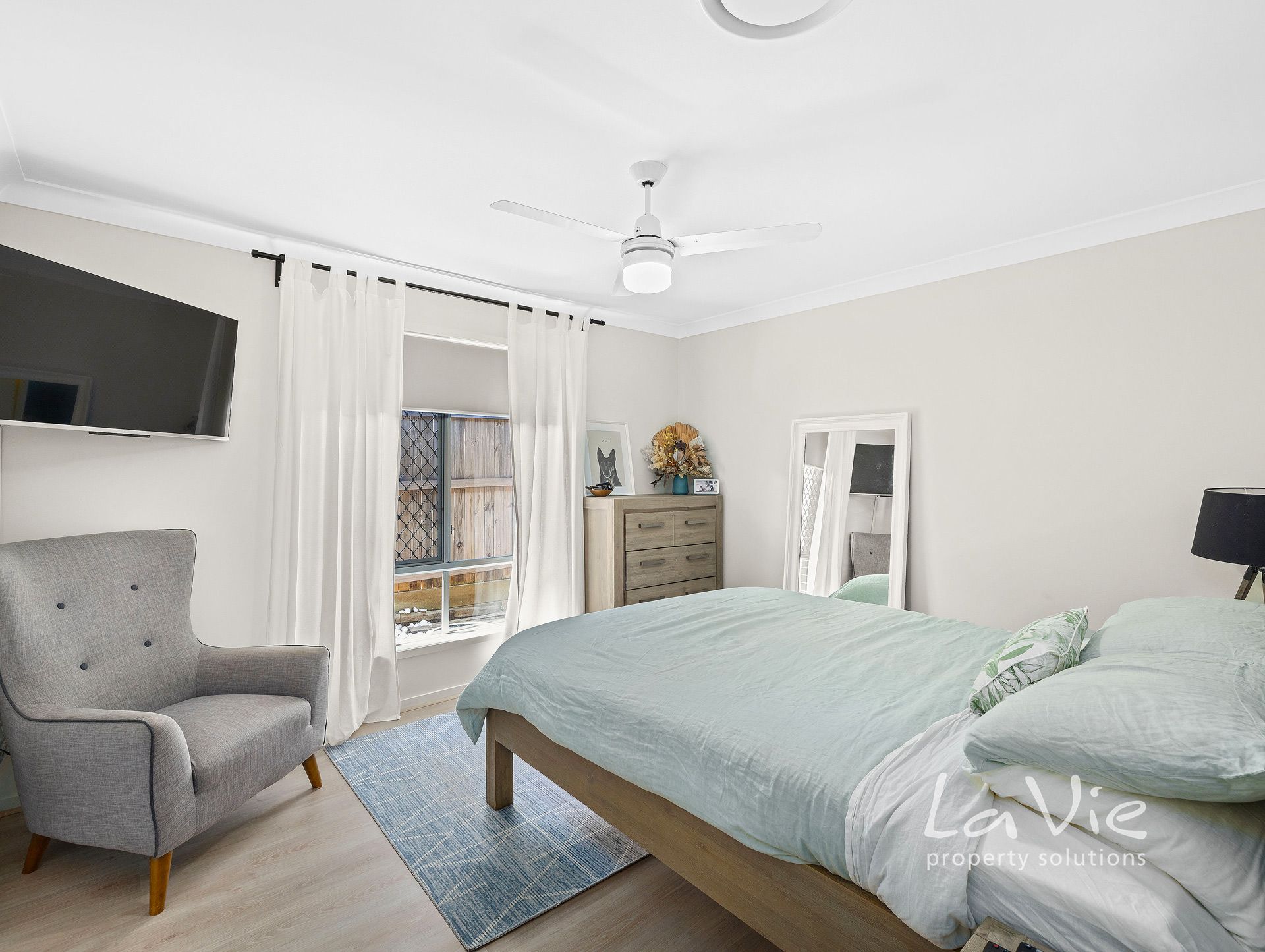 Master bedroom with ceiling fan, walk in robe, ensuite